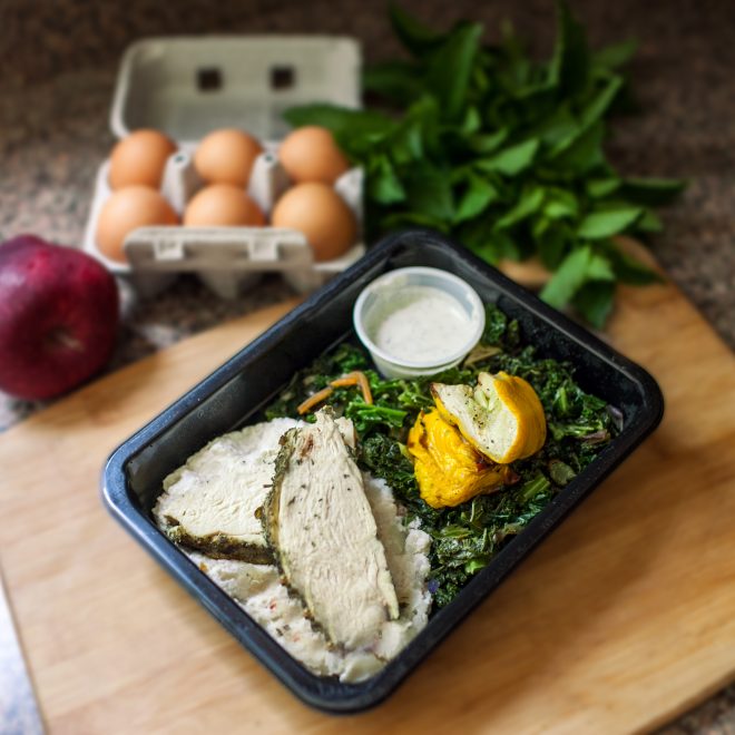 Tender, tasty, juicy fresh baked chicken. Lots of delicious veg. Very filling! The ranch dressing is also very good and not heavy.